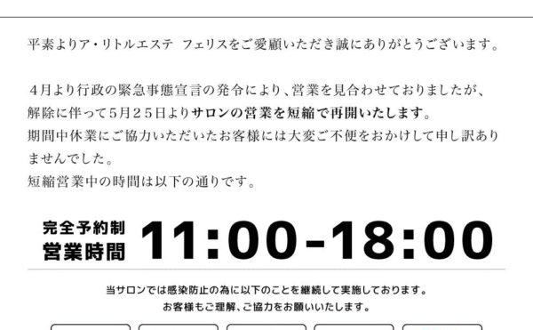2020年5月20日お店からのお知らせ洋子野口 営業再開のお知らせ緊急事態宣言の解除に伴い5月25日(月)から完全予約制で 時間短縮11時~18時 再開を致します。 休業にご協力いただきありがとうございました。 今まで通り検温、消毒をしていきますのでこれからも宜しくお願い致します。 ご […]